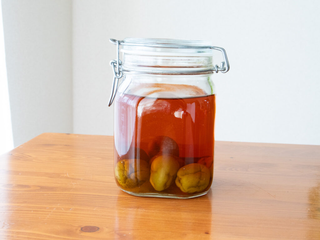 梅酒は、漬けた広口瓶のままでも保存できます。