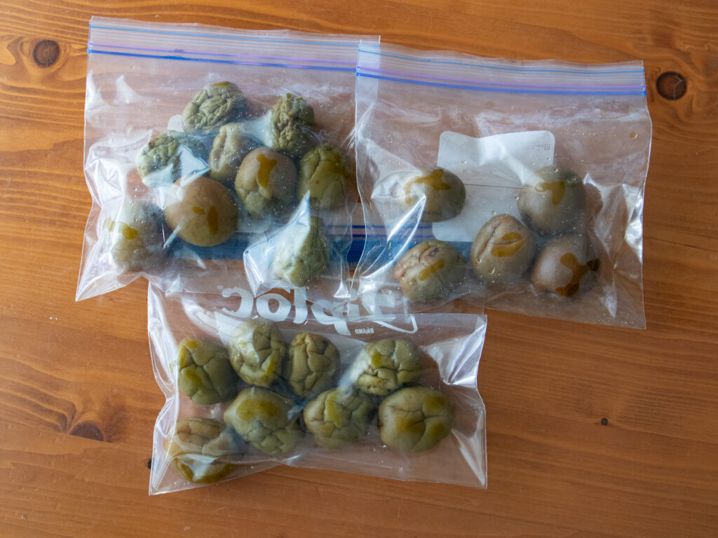 やわらかくなった梅はジップ袋に入れて冷凍。
