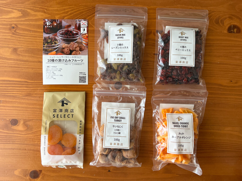 ドライフルーツは、富澤商店で購入した「10種の漬け込みフルーツ」を使用しました。