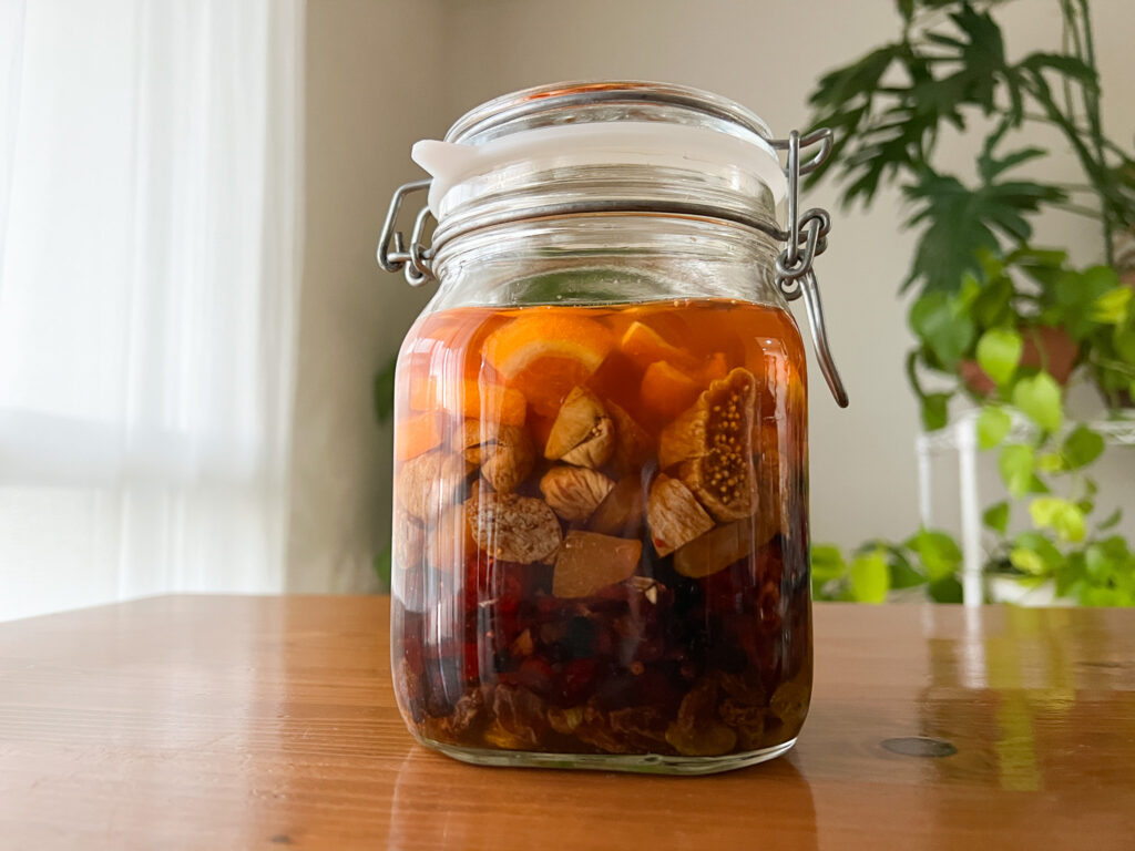 今回使ったのは、きび砂糖で作ったブランデー梅酒で漬けたドライフルーツです。