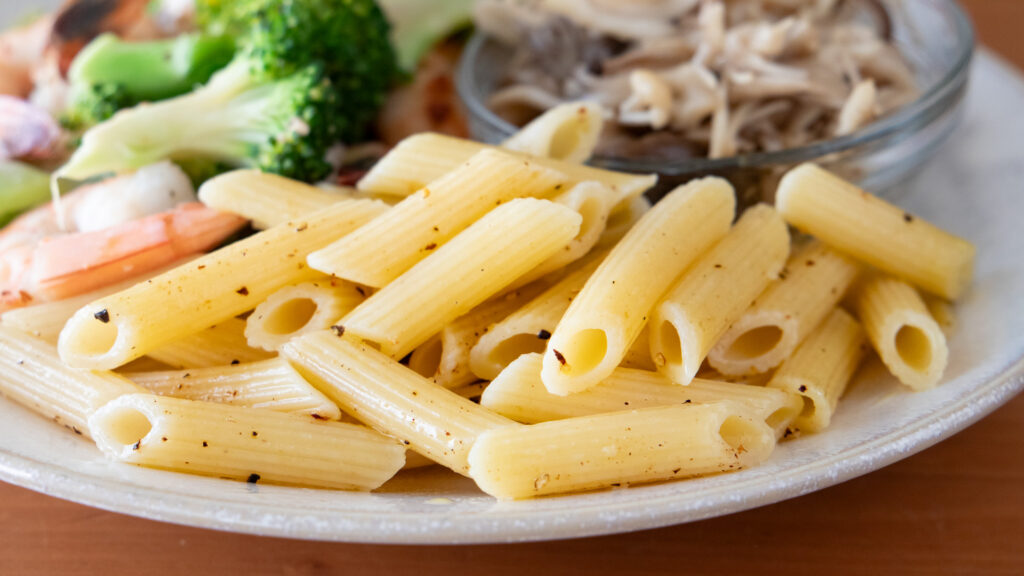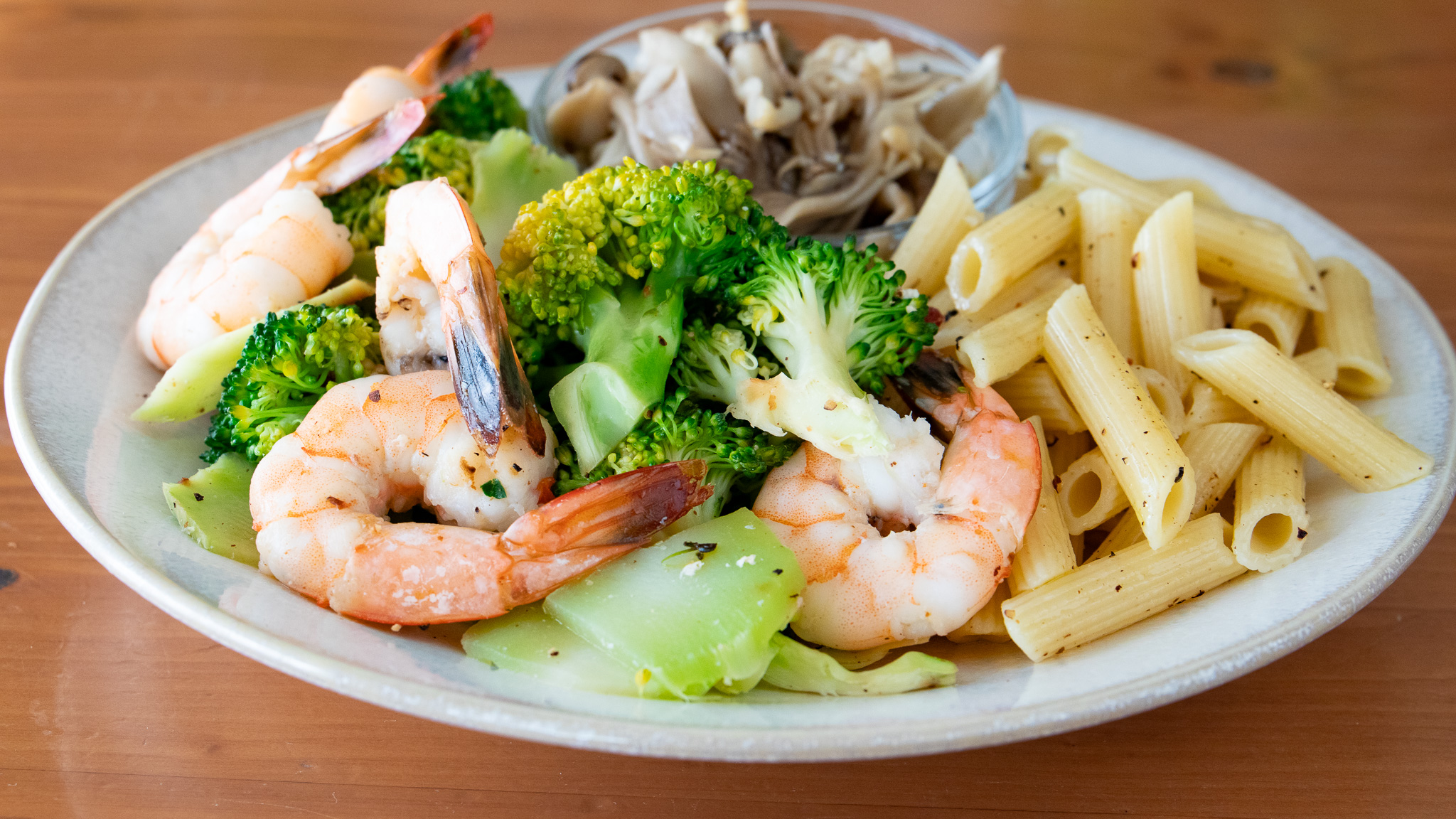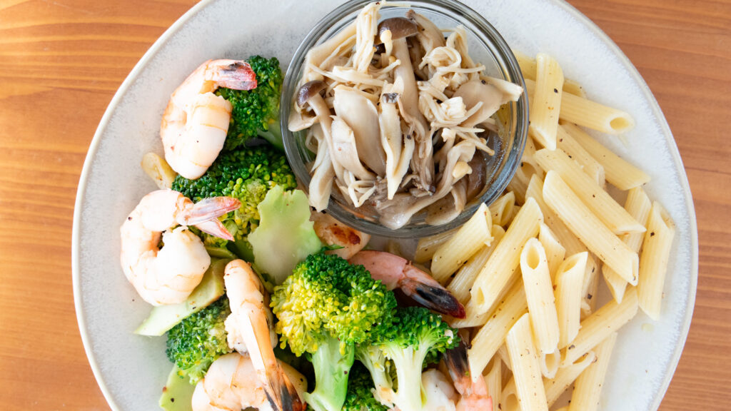 えびとブロッコリー・きのこマリネ・塩ペンネ 502kcal|50代管理栄養士が教えるワンプレート献立