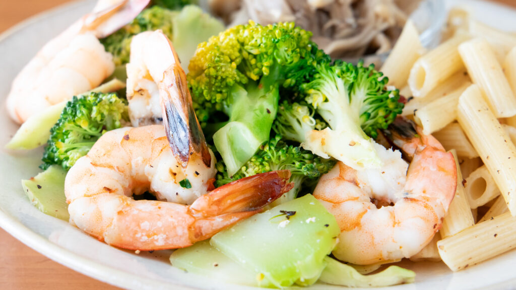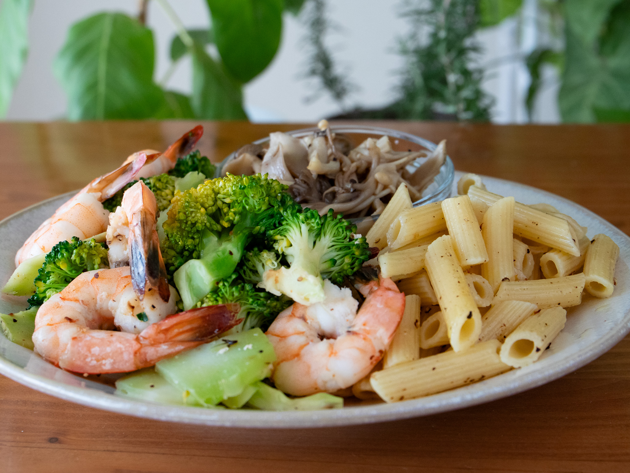 えびとブロッコリー、きのこマリネ、塩ペンネ。