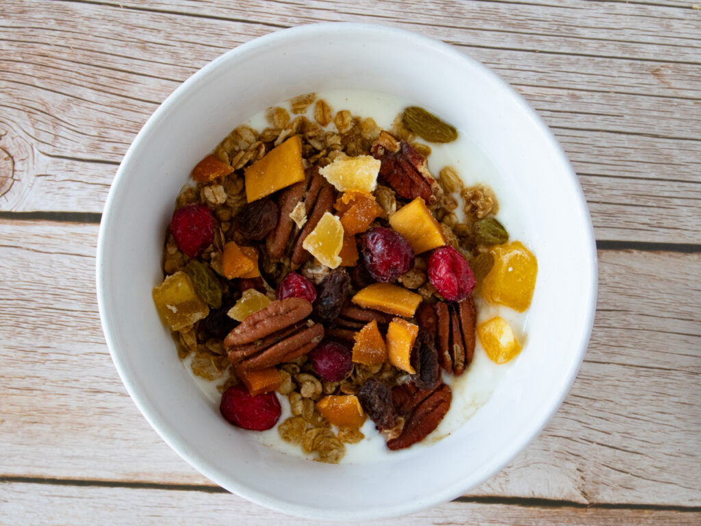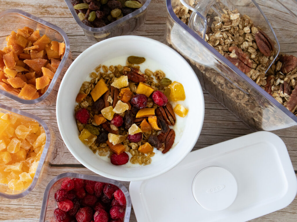 作ったグラノーラはポップコンテナに保存して、食べるときにヨーグルトにのせ、お好みのドライフルーツをトッピング。