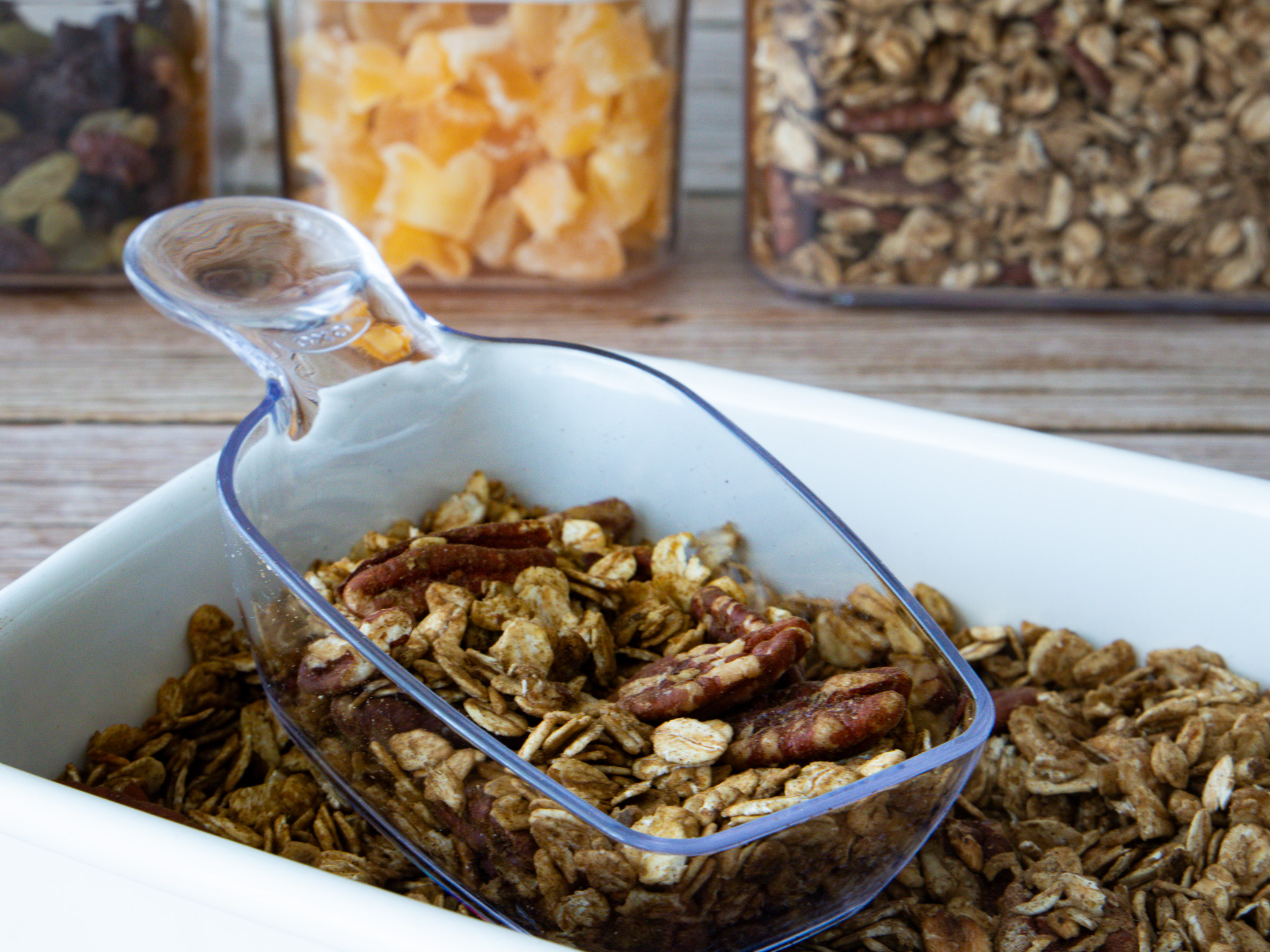 作ったグラノーラはポップコンテナに保存して、食べるときにヨーグルトにのせ、お好みのドライフルーツをトッピング。