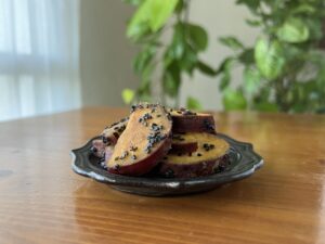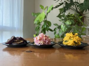 かぼちゃのブラック蒸しパンでも使った黒いマットな小皿を盛りつけに使用しました。