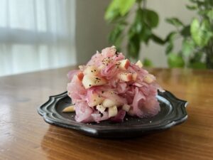 - 紫玉ねぎに、りんご、りんご酢、オリーブオイル、塩・こしょうを加えて混ぜる。