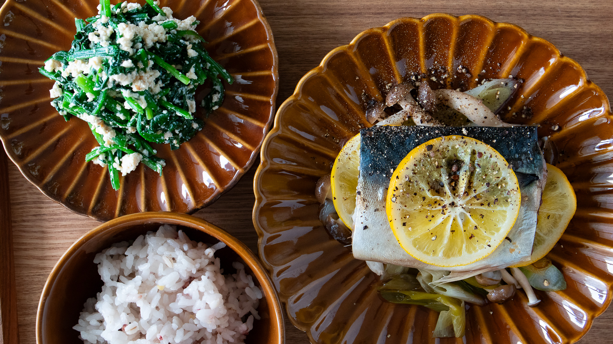 ととのえ献立:鯖のレモン蒸し|ほうれん草の白和え|ごはん