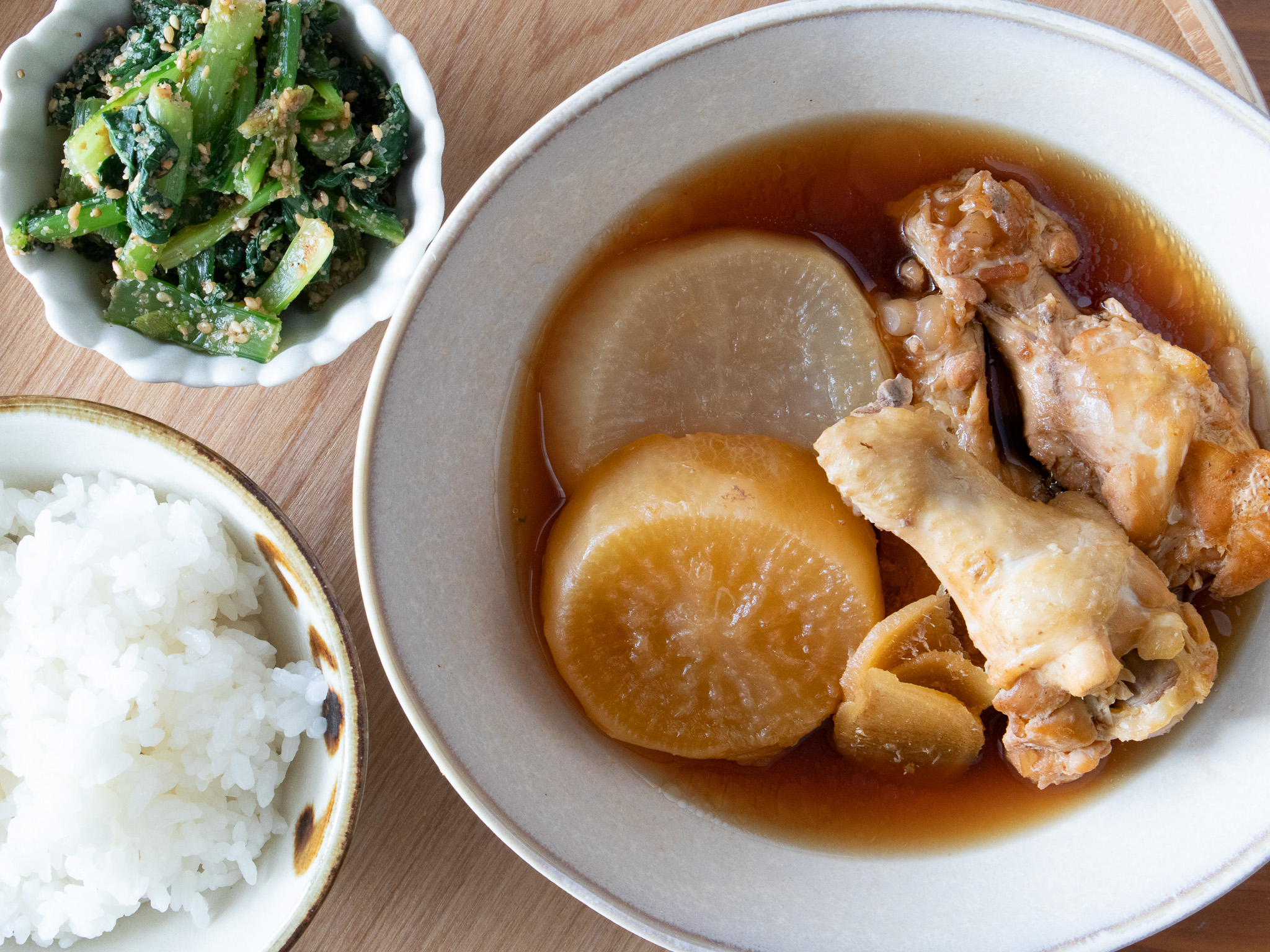 ととのえ献立:大根と手羽元のやさしい煮物・レンチン小松菜のごま和え・ごはん