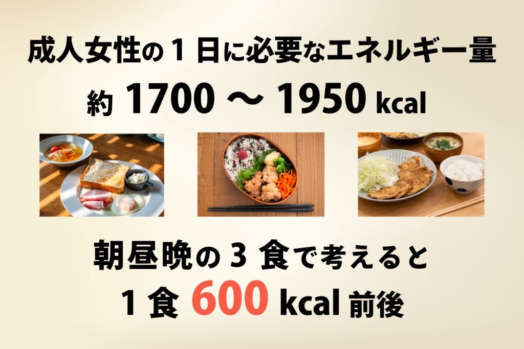 厚生労働省の日本人の食事摂取基準によると、成人女性の1日に必要なエネルギー量は、生活活動量にもよりますが、約1700~1950kcalが目安とされています。これを朝・昼・晩の3食で考えると、1食は600kcal前後となります。