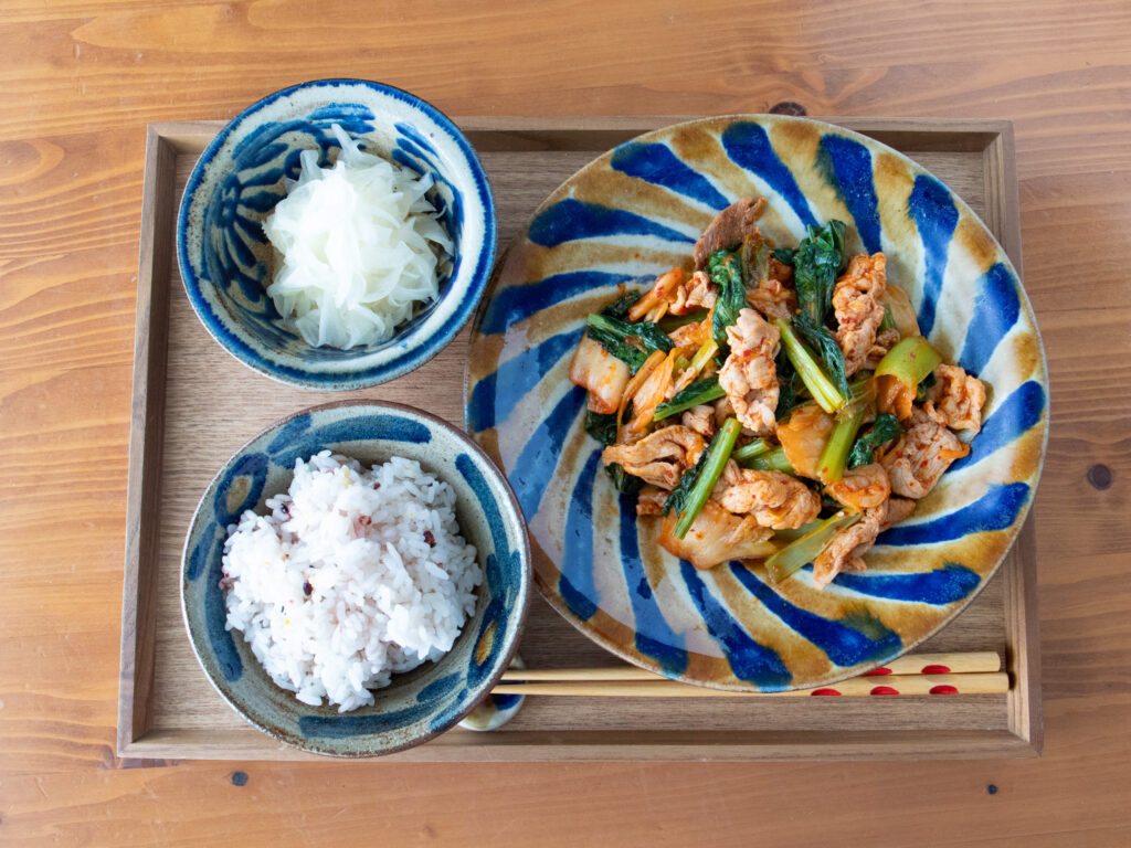 小松菜豚キムチ・新玉ねぎのナムル・ごはん150gのととのえ献立。